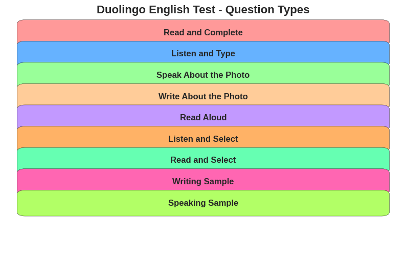 آزمون Duolingo English Test بهگونهای طراحی شده که در مدت زمان کوتاه، ارزیابی جامعی از مهارتهای زبان انگلیسی داوطلب ارائه دهد. این آزمون شامل سه مرحله اصلی است: